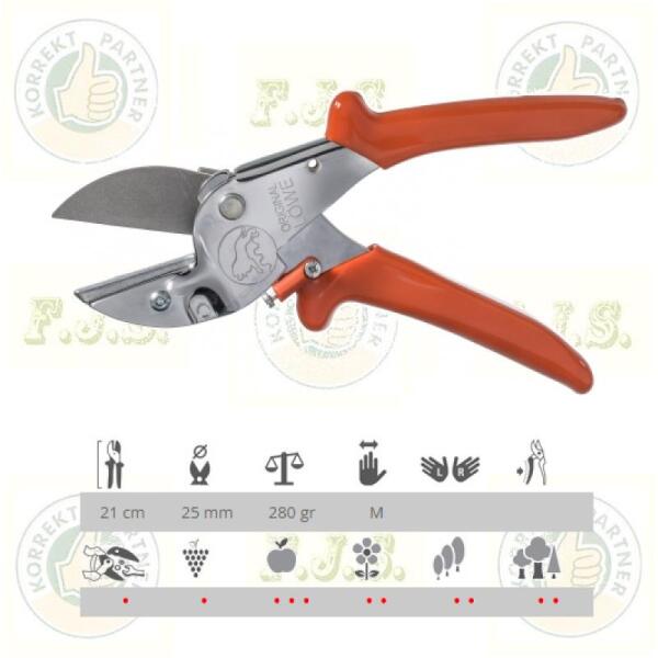 A Löwe 1.107 rávágós metszőolló hajlított nyéllel - klasszikus rávágó modell, a Löwe gyár első metszőollója, mely 1923 óta bizonyít az egész világban. A metszőolló egyenletesen terheli a kezet, így a munka kevésbé fárasztó. Nem roncsolja a növényt. A belső hajlított nyél, optimális kis kezűek részére. Alkalmazás: Szőlőskertekben, gyümölcsösökben, kertészetekben, de az otthoni kerti munkákhoz is használható Anyaga: Magas minőségű nemesacél, króm-vanádium ötvözet, Főbb jellemzők: - Klasszikus ágvágó modell - Gumis, hajlított nyéllel - Egyenletesen terheli a kezet, így a munka kevésbé fárasztó - nem roncsolja a növényt - Anyaga miatt rendkívül hosszú élettartam - Összes alkatrésze cserélhető